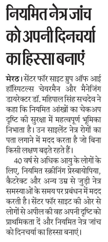 Press Releaseनियमित नेत्र जांच को अपनी दिनचर्या का हिस्सा बनाएं Posted on October 9, 2025December 2, 2025 by Centre For Sight 09 Oct Centre For Sight रेगुलर आई चेकअप से दृष्टि की सुरक्षा और आंखों की बीमारियों से बचाव संभव रेगुलर आई चेकअप से दृष्टि की सुरक्षा और आंखों की बीमारियों से बचाव संभव