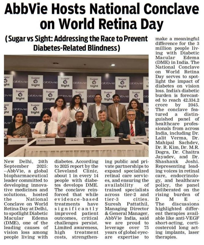 Press ReleaseAbbVie Hosts National Conclave on World Retina Day Posted on September 2, 2025December 2, 2025 by Centre For Sight 02 Sep Centre For Sight Abb Vie Hosts National Conclave on World Retina Day to Spotlight Rising Burden of Diabetic Macular Edema डायबिटिक हैं तो फौरन कराएं रेटिना की जांच, बचाएं आंखें