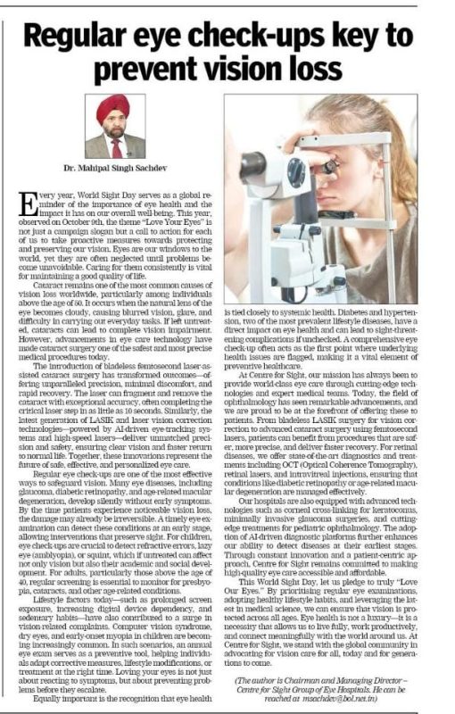 Press ReleaseRegular eye check-ups key to prevent vision loss Posted on October 9, 2025December 2, 2025 by Centre For Sight 09 Oct Centre For Sight Regular Eye check-ups hold the key to Healthy Vision for All Ages: Dr. Mahipal Singh Sachdev Vision for All